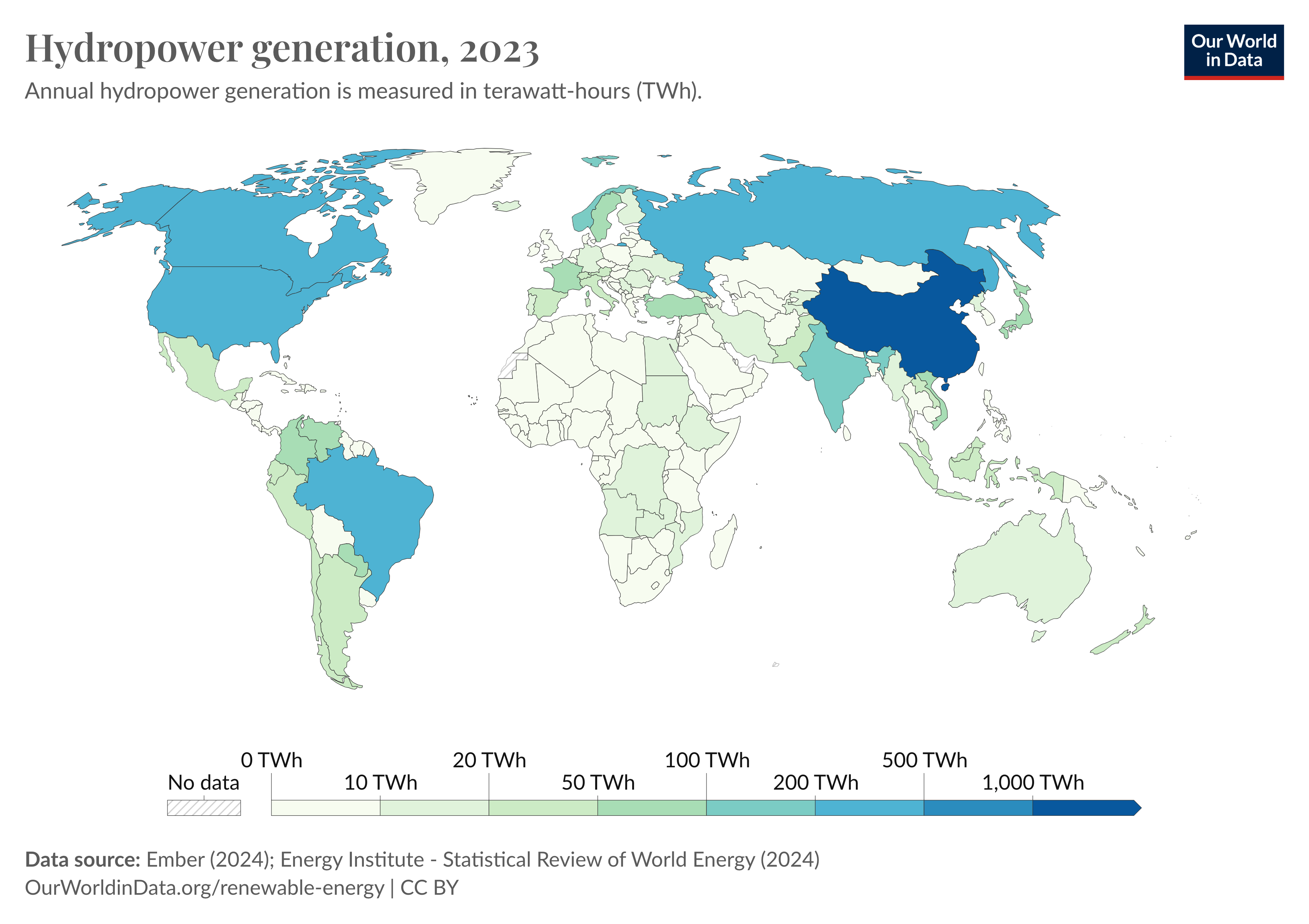 In 2023, China was the leading country in hydropower generation worldwide, generating a capacity of 1,245.17 TWh. It was followed by Brazil(431.28 TWh), Canada(365.39 TWh), United States(233.96 TWh) and Russia(200.60 TWh).
